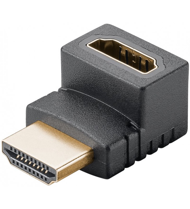Goobay HDMI™ Angled Adapter 90°, Gold-Plated (8K@60HZ), black, Dust protection Bag - HDMI™ female (Type A) > HDMI™ male (Type A) 90° 90° The 90° angle of the plug allows for an upward angled connection even in confined spaces, e.g. on the rear port of a device The HDMI™-to-HDMI™ adapter transmits high-resolution images of up to 8K @ 60 Hz and 4K @ 120 Hz (backward compatible) and reaches a data rate of up to 48 Gbit/s Ideally suited for audio and video transmission between TV/monitor and projectors, game consoles (e.g. PlayStation 5, Xbox) or streaming receivers (e.g. Amazon Fire TV, Apple TV) The integrated Ethernet channel (HEC) connects any HDMI™ device to devices in the wired network without a separate internet cable The CEC function (Consumer Electronics Control) creates flexible operability via only one remote control, e.g. for switching on several paired HDMI™ devices with a single press of a button Supports 8K UHD, 3D at 4K UHD as well as HDR (High Dynamic Range) for excellent, high-contrast picture quality, also supports the HDCP 2.2 encryption system Supports advanced audio features such as eARC (Enhanced Audio Return Channel) and ARC (Audio Return Channel) for easy digital transmission from the TV to a soundbar or hi-fi system