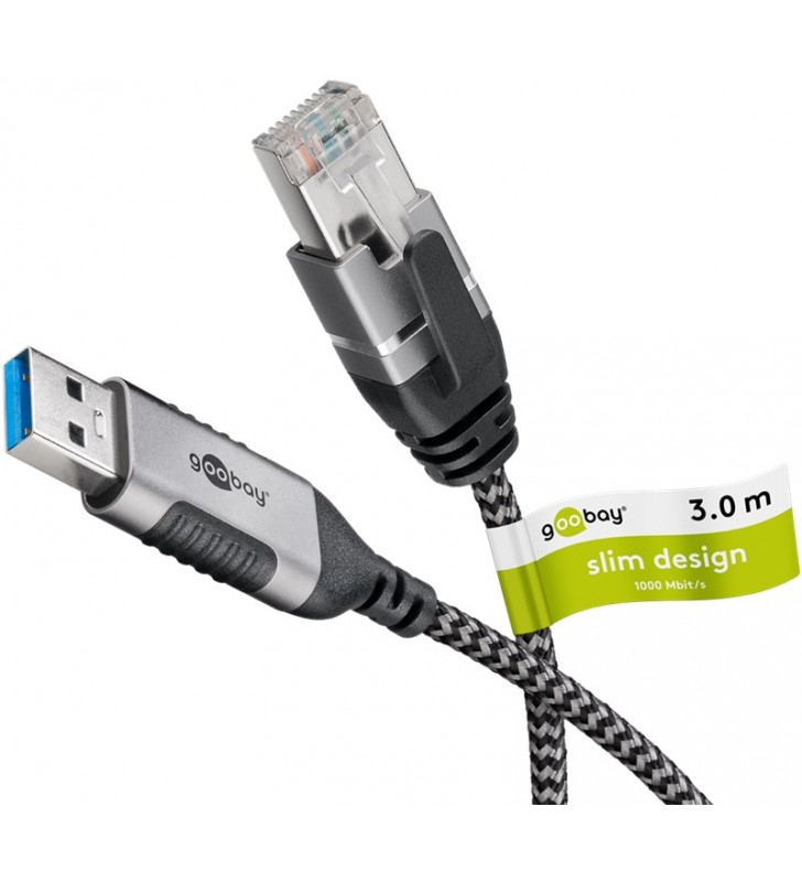 Goobay USB-A 3.0 to RJ45 Ethernet Cable, Slim, 3 m, black, Plastic bag - connects router, modem or network switch to USB-A port of a laptop or tablet The LAN cable provides a stable, wired internet connection to USB-A devices without their own network port With CAT 6, the cable achieves a transmission rate of up to 1 Gbit/s With its smart, slim design, the CAT 6 cable ensures a subtle look and is a compact, lightweight solution when travelling and on the road The braided, durable textile jacket of the USB cable has a pleasant feel and is gentle on sensitive surfaces High-quality, robust metal plugs with bend protection ensure an especially long service life, with the foil shielding protecting the cable from interference The USB-A connector is compatible with notebooks and tablets from popular brands such as Lenovo, HP or Dell as well as with Windows, macOS and Android, and is backwards compatible with USB 2.6 Please note: The internet cable is not suitable as a rollover cable for game consoles