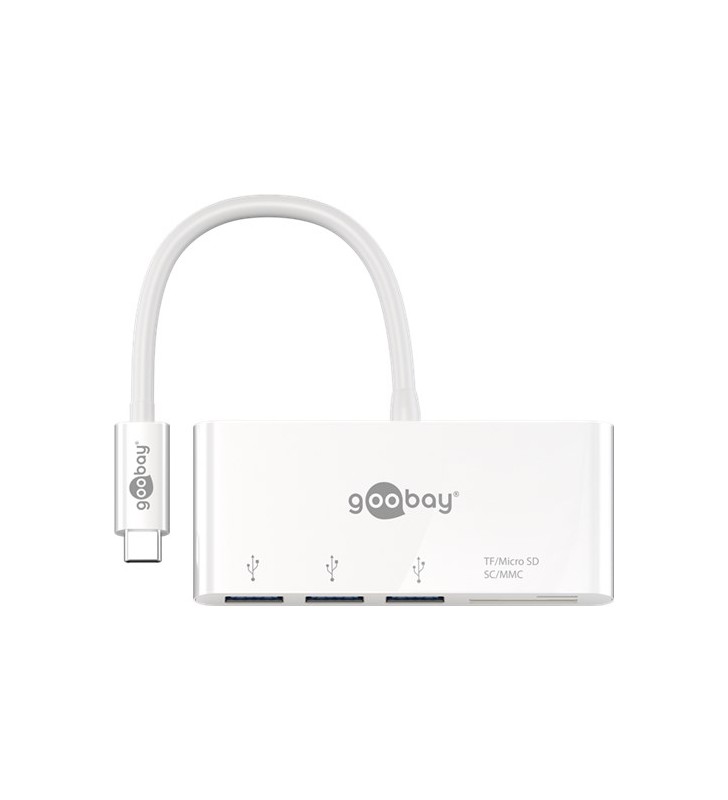 Goobay USB-C ™ Multiport Adapter CardReader, hvid, 0,15 m, plastikpose - tilføjer tre USB 3.0-forbindelser og et kortspor til SD / MMC og micro SD-kort til en USB-C ™ -enhed spejler signaler fra USB-C ™ til USB enheder læser SD / MMC og micro SD-hukommelseskort 3x USB-A 3.0-porte til hurtig dataoverførsel og opladning, der passer til MacBook og MacBook Pro og andre enheder med USB-C ™ -forbindelse