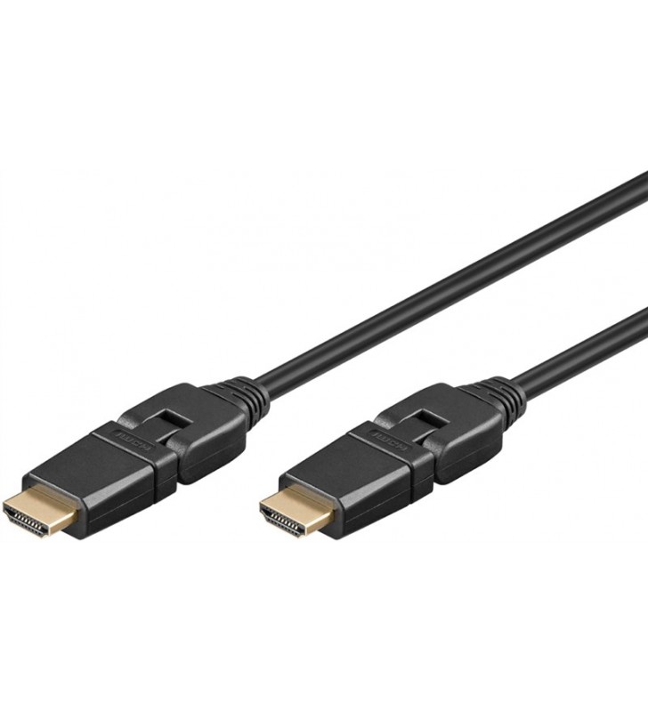 Goobay Series 2.0 High Speed HDMI™ 360° Cable with Ethernet, 1.5 m, Black, Dust protection Bag - HDMI™ connector male (type A) > HDMI™ connector male (type A), 360° rotat Gold-plated HDMI™ plugs that rotate horizontally and vertically guarantee a perfect signal quality, clear sound and razor-sharp video and picture quality. High-definition signal transmission with up to 4K @ 60 Hz The High Speed HDMI™ cable links TVs and monitors with game consoles such as PlayStation or Xbox, as well as beamers, projectors and streaming receivers e.g. Amazon Fire TV or Apple TV. HDMI™ connection for current features such as ARC (Audio Return Channel), HDCP or 3D content in Full HD