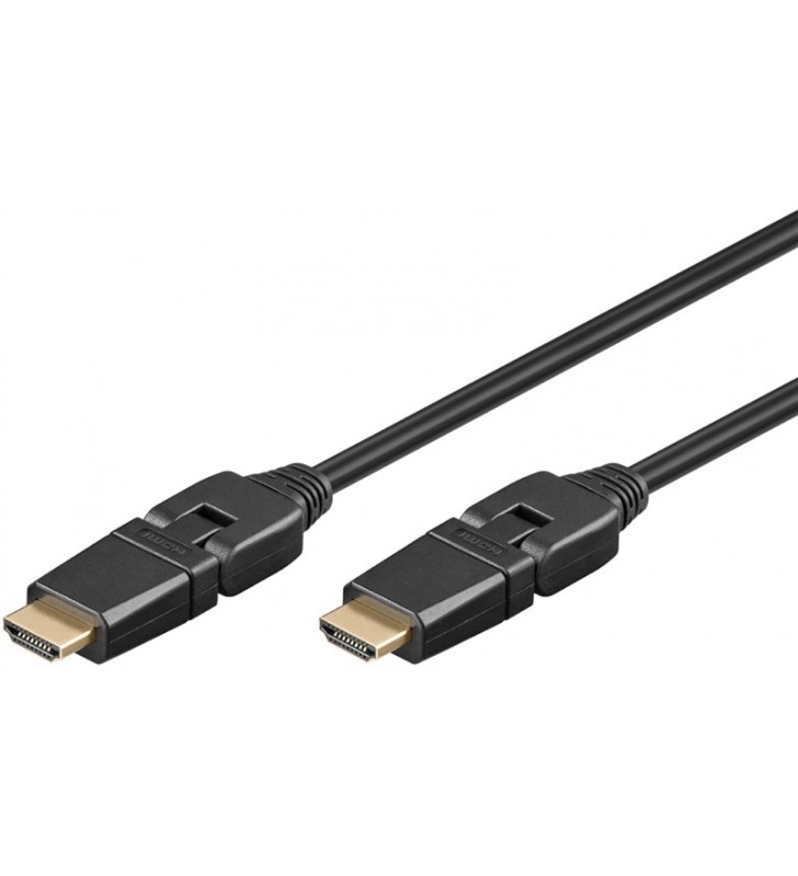 Goobay Series 2.0 High Speed HDMI™ 360° Cable with Ethernet, 2 m, Black, Dust protection Bag - HDMI™ connector male (type A) > HDMI™ connector male (type A), 360° rotatab Gold-plated HDMI™ plugs that rotate horizontally and vertically guarantee a perfect signal quality, clear sound and razor-sharp video and picture quality. High-definition signal transmission with up to 4K @ 60 Hz The High Speed HDMI™ cable links TVs and monitors with game consoles such as PlayStation or Xbox, as well as beamers, projectors and streaming receivers e.g. Amazon Fire TV or Apple TV. HDMI™ connection for current features such as ARC (Audio Return Channel), HDCP or 3D content in Full HD
