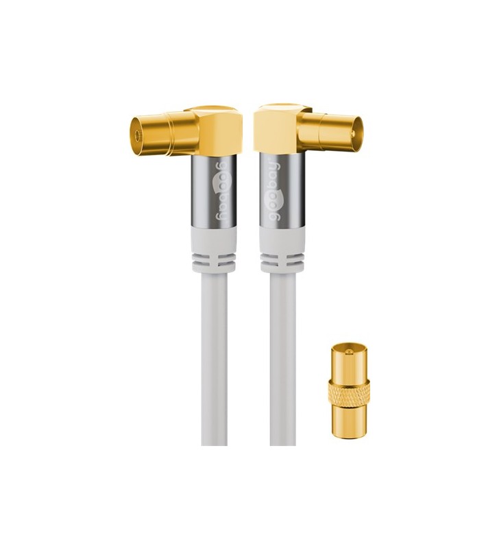 Goobay TV antenna cable (135 dB), 4x shielded, 10 m, white, Plastic bag - gold plated, Coaxial female 90° > Coaxial male 90° inner conductor made of ultrapure OFC solid copper for optimal conductive and transmission properties, ensuring virtually loss-free signal routing 4-layer, ultrathick shielding material (made of ultrathick 2-layer mesh and 2-layer film) with 135 dB shielding capability the perfect balance of shielding and flexibility – the ideal shielding for ensuring perfect reception and disruption-free transmission massive solid metal connector with gold-plated contacts – for optimal durability, stability and precision optimised bend protection and flexible cable sleeving prevent the maximum bending radius from being exceeded including a male to male coupler