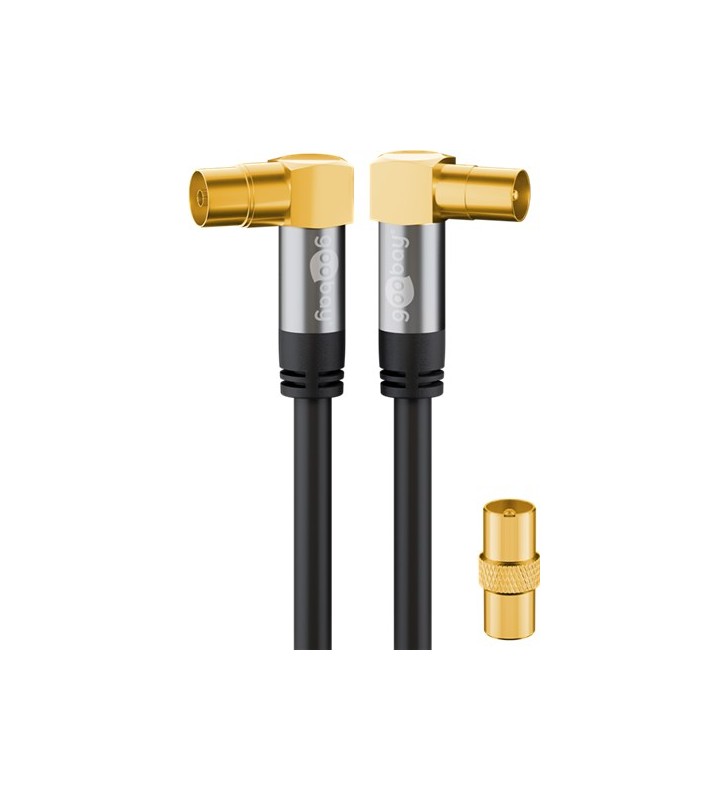 Goobay TV antenna cable (135 dB), 4x shielded, 3 m, black, Plastic bag - gold plated, Coaxial female 90° > Coaxial male 90° inner conductor made of ultrapure OFC solid copper for optimal conductive and transmission properties, ensuring virtually loss-free signal routing 4-layer, ultrathick shielding material (made of ultrathick 2-layer mesh and 2-layer film) with 135 dB shielding capability the perfect balance of shielding and flexibility – the ideal shielding for ensuring perfect reception and disruption-free transmission massive solid metal connector with gold-plated contacts – for optimal durability, stability and precision optimised bend protection and flexible cable sleeving prevent the maximum bending radius from being exceeded
