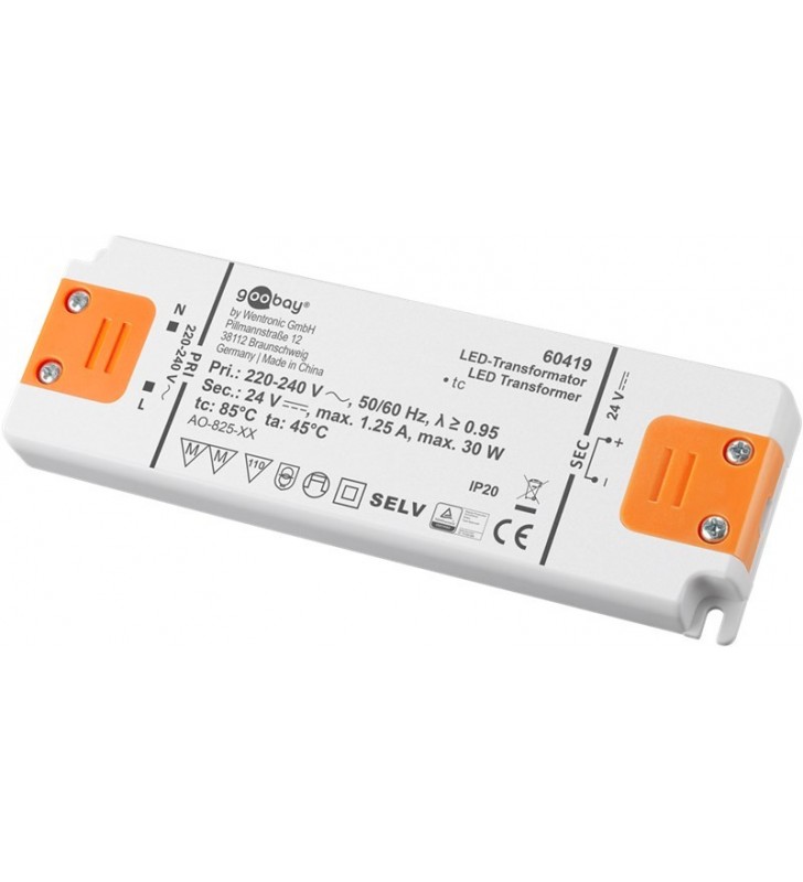 Goobay LED Transformer 24 V (DC)/30 W, white-orange, Standing Box - 24 V DC for LEDs up to 30 W total load Compact DC transformer without minimum load for connecting LED lamps with 24 V to 230 V A flat design and low heat build-up allow for space-saving installation even in confined spaces. The transformer is approved for mounting on furniture and can be placed discreetly, e.g. at the back of cabinets. Easy connection thanks to the luster terminals integrated in the LED driver Switching power supply with short-circuit and surge protection, protection class IP20 and safe electronic isolation according to appliance class II Electronic transformer with constant 24 V output voltage, suitable for LEDs with ballast electronics and for parallel circuits Dimensions (L x W x H): 154 x 50 x 14 mm, please note: Electronic ballast is not dimmable