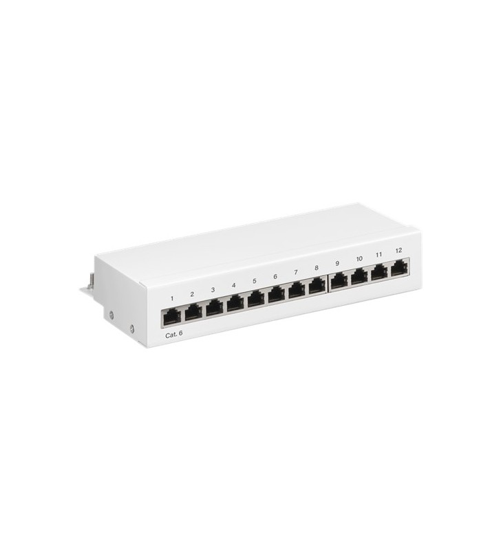 Goobay CAT 6a Mini/Desktop Patch Panel, 8 Port, white, Paperbox with Label - STP shielded patch field (1 U) for on wall / desktop mounting internal connection technology for LSA insulation displacement terminals colour coding in accordance with TIA 568 A/B for cable diameters of up to 0.64 mm (22–26 AWG), solid/stranded ‘Easy open’ housing without screws and tool shielded ports mounting screws included