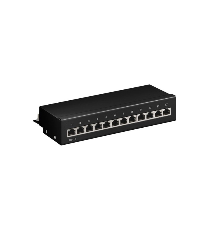 Goobay CAT 6 Mini/Desktop Patch Panel, 12 Port, black, Paperbox with Label - STP shielded patch field (1 U) for on wall / desktop mounting internal connection technology for LSA insulation displacement terminals colour coding in accordance with TIA 568 A/B for cable diameters of up to 0.64 mm (22–26 AWG), solid/stranded ‘Easy open’ housing without screws and tool shielded ports mounting screws included