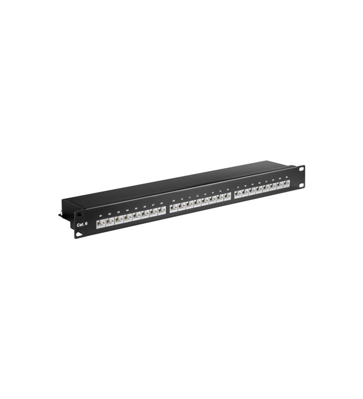 Goobay CAT 6 19 inch (48.3 cm) Patch Panel, 24 Port, black, Paperbox with Label - STP shielded patch field (1 U) for assembly in 48.3 cm (19'') panel boxes internal connection technology for LSA insulation displacement terminals colour coding in accordance with TIA 568 A/B for cable diameters of up to 0.64 mm (22–26 AWG), solid/stranded