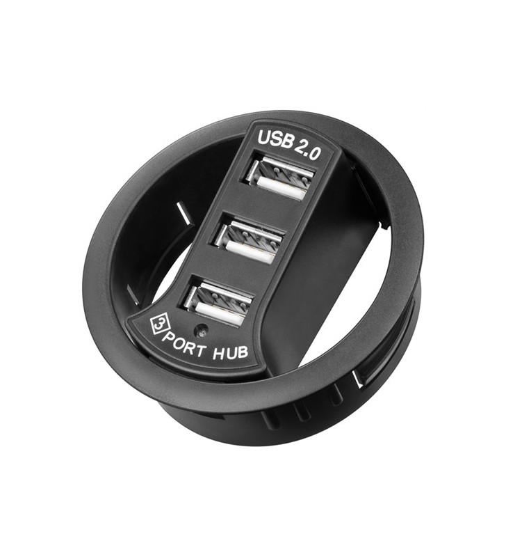 Goobay 3 port USB 2.0 Hi Speed In-Desk HUB + audio, black, 1.5 m, Flap-over Blister - to be mounted 60 mm desk feedthrough with audio connection to connect up to 3 USB devices to a USB port to mount inside the desk cable feedthrough - ø 60 mm USB 2.0 up to 480 Mbps data transfer backwards compatible with USB 1.1 with 2 audio jacks 3.5 mm to connect a headset Windows 2000, XP, VISTA, 7, 8, 10 and MacOS compatibile